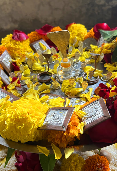 Kalsarp puja is one of the most powerful spiritual practices that aims to align planetary energies and make positive changes in your life. You must approach this Puja with honesty, faith and a sincere desire for spiritual development. The astrological phenomenon of Kalsarp dosha occurs when all the planets are placed between the shadow of Rahu and the shadow of Ketu in your birth chart. It is believed that this dosha brings various difficulties and obstacles into your life. The traditional remedy for this dosha is Kalsarp puja.